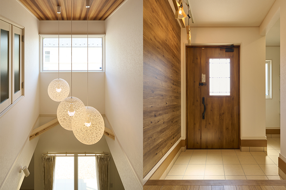 夫:吹き抜けの天井のクロスもすごく気に入っています。後は…玄関ドアは僕が決めたんですよ。でも、玄関を入ってすぐの木目のクロスは、妻がSNSでアイデアを見つけました。