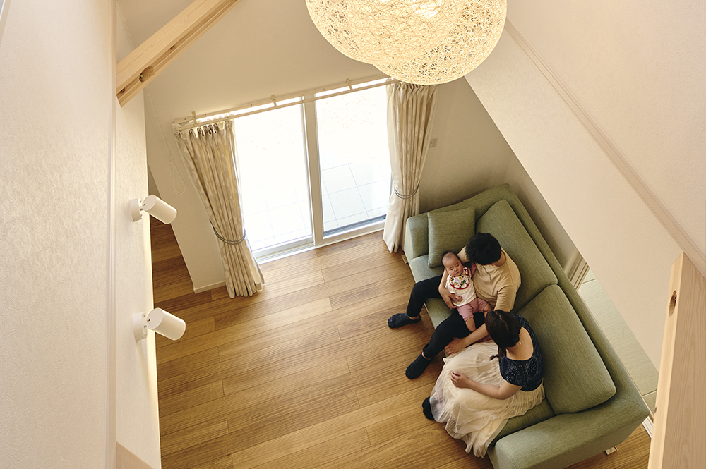 夫:元々、吹き抜けは妻の要望でした。だから僕としては、吹き抜けにしたことで耐震と全館空調(※24時間全熱交換型換気システム)の取り入れを決意しました。初夏のこの時期は、吹き抜けのおかげで明るくて快適ですが、空調システムは家中に暖かい空気を循環させてくれるそうなので、冬にどんな風に過ごせるのかとても楽しみなんです。