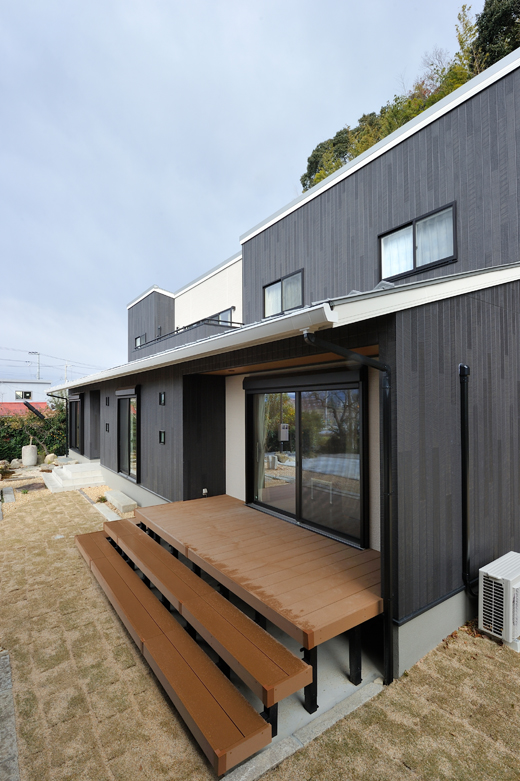 リビングに続く広々としたデッキテラス。階段状に施工しているので、安全で使い勝手も抜群。玄関ポーチを挟んだ左手奥側には、和室の縁側から眺められる立派なお庭が広がります。