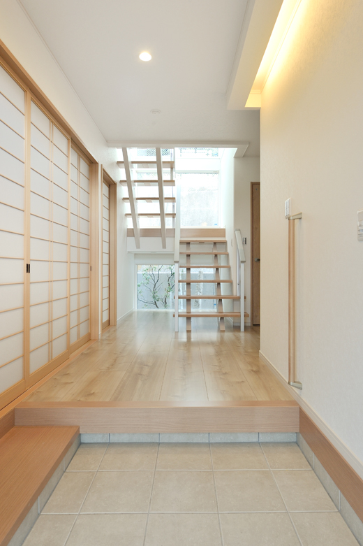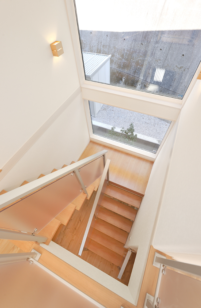 玄関の戸を開けると目に飛び込んでくる光景に圧倒されます。2階天井まで続く大きなガラス窓、スケルトン階段、そして坪庭と裏山の借景。明るくモダンなこの家を象徴するスペースです。