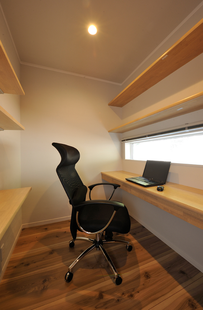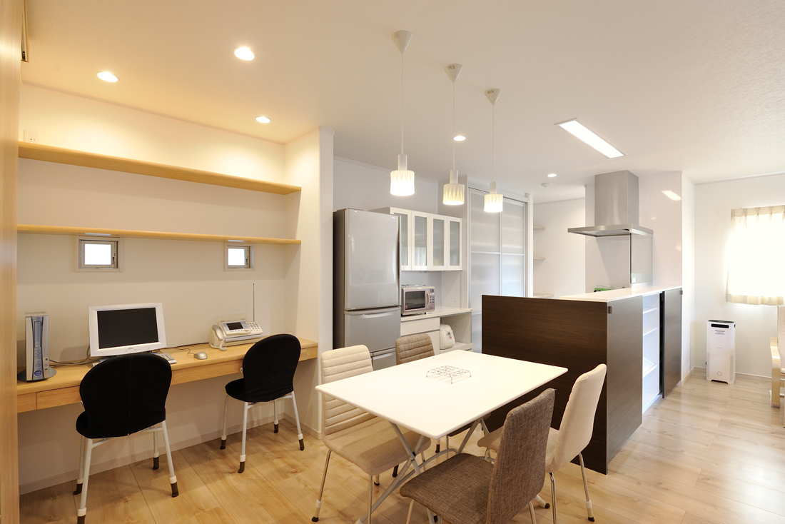 家事動線を重視した使い勝手の良いダイニングキッチンは横並びのレイアウト。キッチンの奥にはストック棚を備えたパントリーがあり、勝手口の土間に続いています。ダイニング側の壁面には家族みんなで使えるようにとカウンターテーブルを造作。パソコンや家事など便利に使えます。