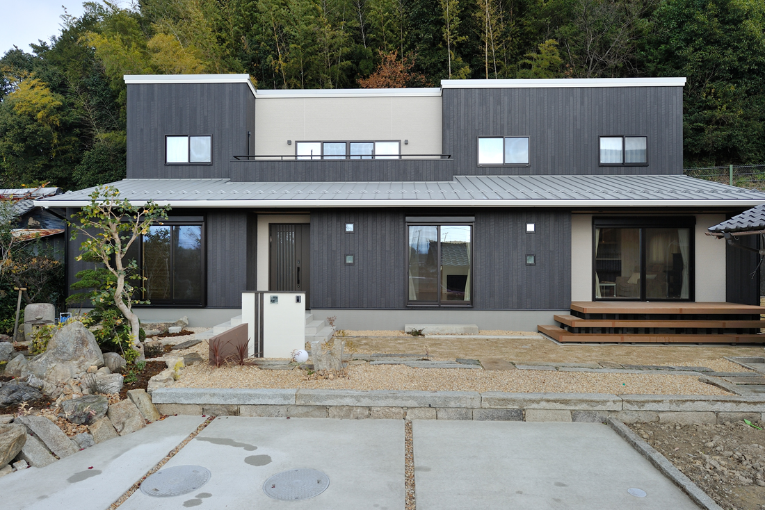 和テイストを取り入れたシンプルモダンの住まいは、木目調のサイディングや敷石のアプローチで風情たっぷりな外観に。昔ながらの家屋が立ち並ぶ集落の風景に馴染みながらも目を惹く一邸です。