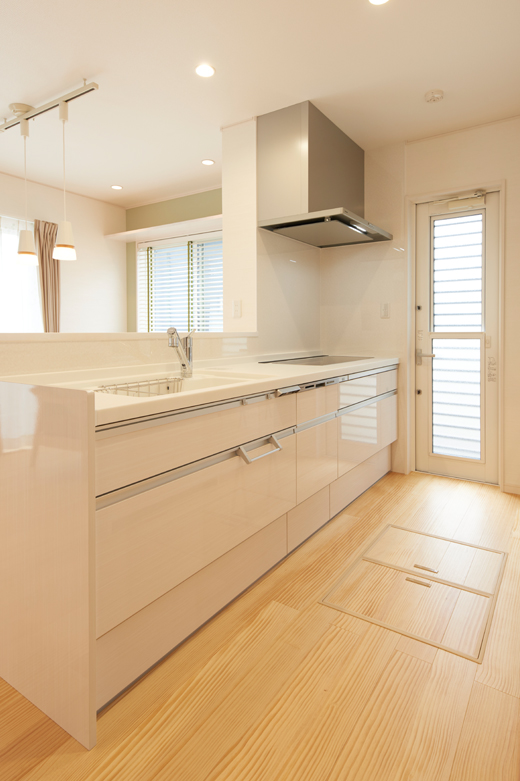 真っ白で清潔感のあるキッチン。ダイニングからリビング奥の和室まで見渡せる配置です。IHクッキングヒーターは、コンロ4つが横に並ぶ「マルチワイドIH」を採用。お料理がはかどります。