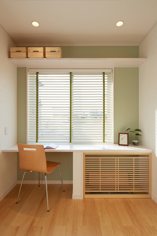 ダイニング横に設けたスタディコーナー。子どものリビング学習や読書スペースにと自由に使えます。右側のガラリには、快適な住まいのヒミツ、床下エアコンが設置されています。