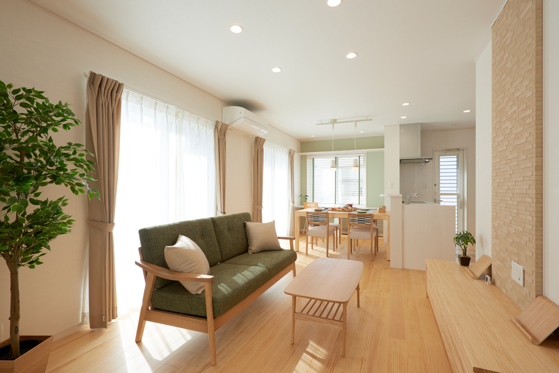 玄関ホールからLDKまでの床は、一年中素足でも気持ちの良い無垢材を採用。同じ色味で揃えた造り付けのAVボードや背面のパネルなど、ナチュラルテイストたっぷりの空間でゆったりくつろげます。