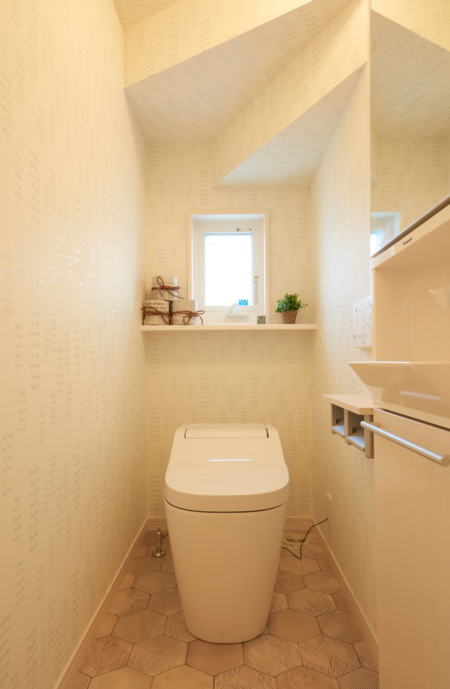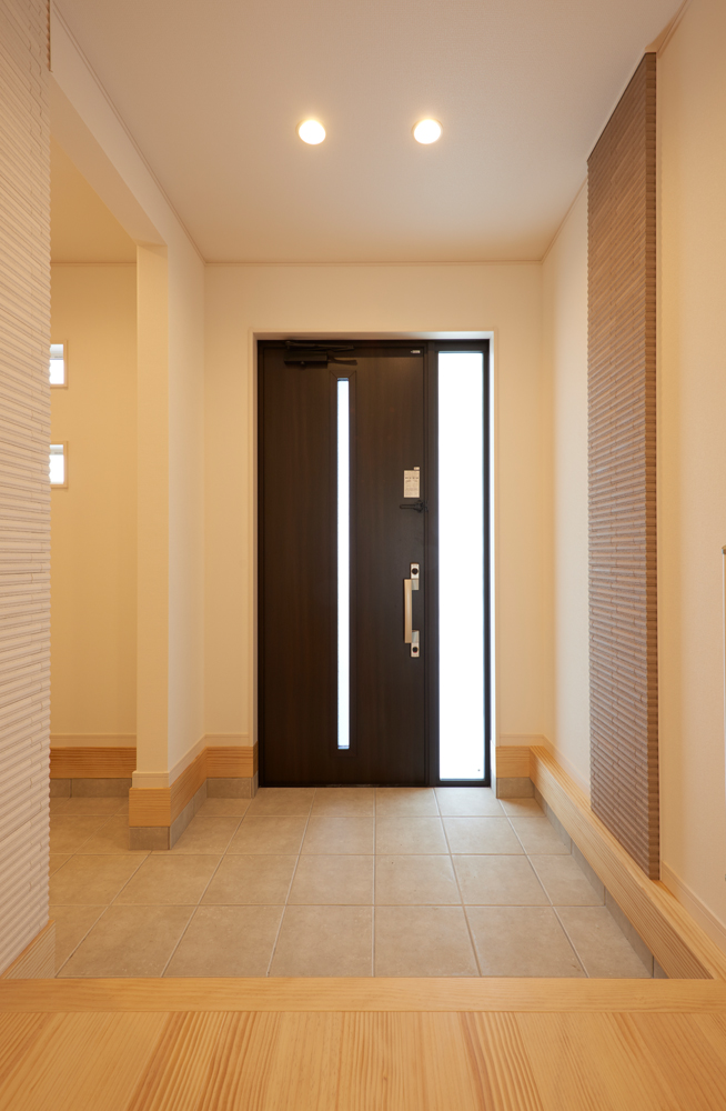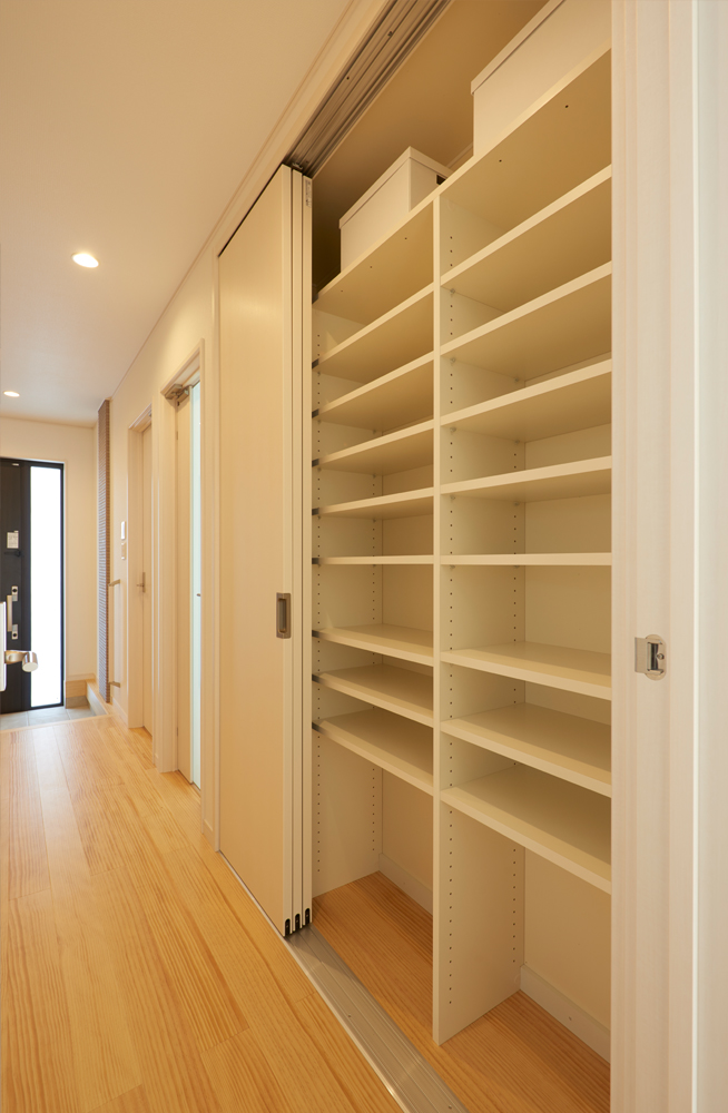 家族用と来客用に分けた玄関。大容量のシューズクローゼットには便利な全身鏡、壁面には嫌なニオイを低減してくれるエコカラットを設置しました。 階段下のデッドスペースを活用したトイレはタンク一体型ですっきりと。タイル調の床がおしゃれです。 廊下の壁面には適度な奥行きの収納を確保。日用品や食材など、たっぷり片付けられます。