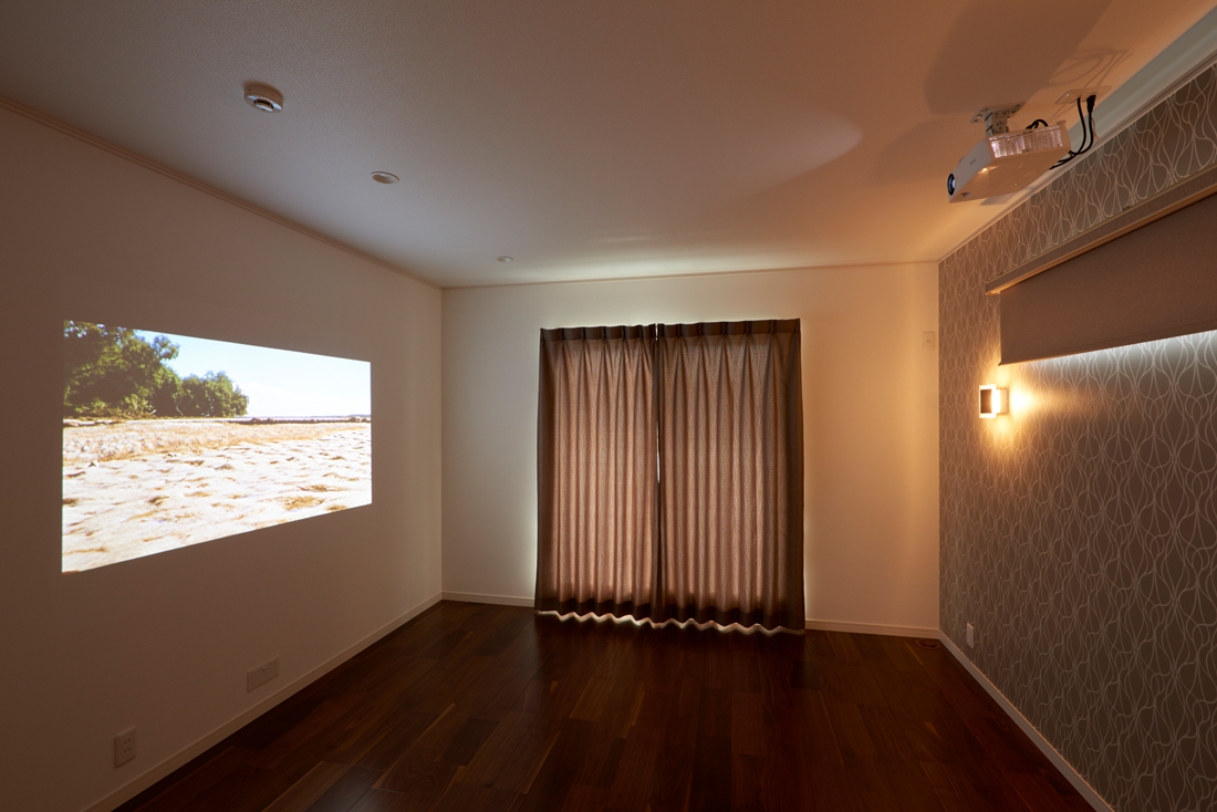 寝室は、床の色をダークブラウンにするなど、全体的に落ち着いた雰囲気に。プロジェクターを設置してあるので、夫婦はもちろん家族でミニシアターを楽しめます。