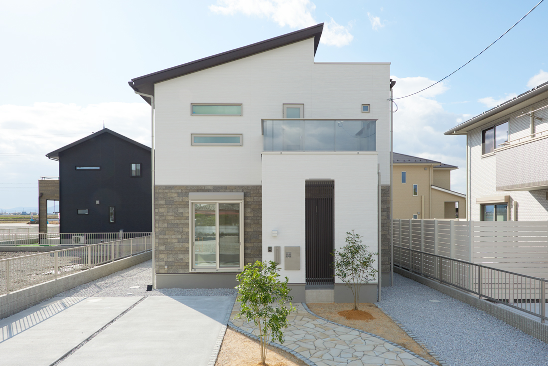 ツートーンカラーの外壁に、片流れ屋根の組み合わせがモダンな外観。目隠しを兼ねた格子のある玄関前の壁には宅配ボックスを設けるなど実用性も。さらに太陽光発電搭載のZEH、耐震等級3を取得した安心の住まいです。