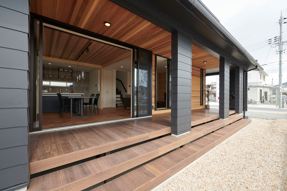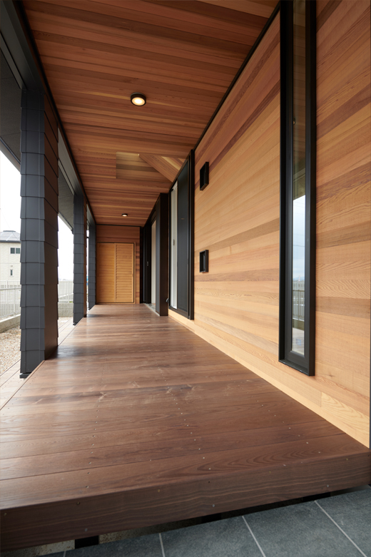 玄関ポーチからつながるウッドデッキ。レッドシダーが見せるボーダー模様が美しい。たくさんある子どもの遊び道具やアウトドアグッズなどは奥に設けた収納にそのまましまえます。
