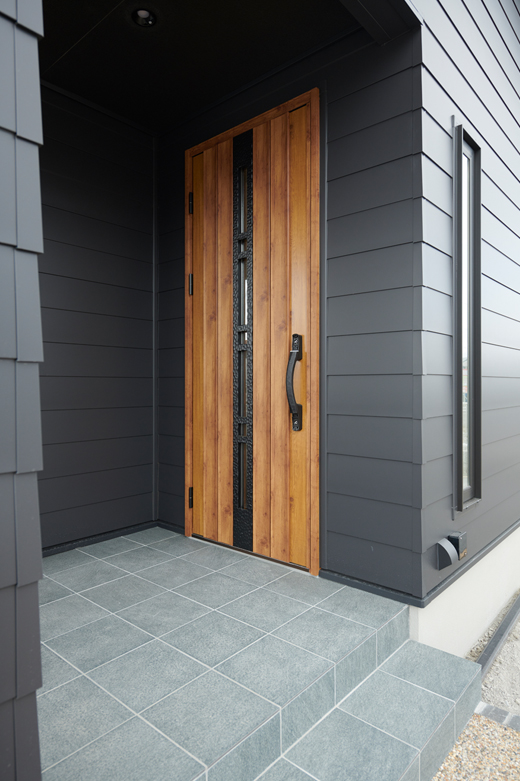 外壁に合わせ、玄関ドアも木目調を採用しデザイン性を高めます。広い玄関ポーチで出入りもスムーズ。手前の壁には表札、ポストに宅配ボックスも埋め込まれていて景観を損なわずにすっきりです。