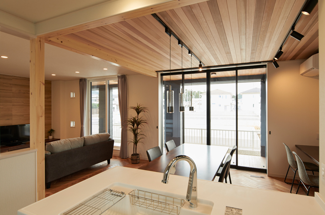 ウッドデッキは使い勝手の良い階段状。ダイニングとの間にある大きな開口部を全開にすると家の中と外が一体に。天井と軒天には同じレッドシダーが貼ってあり、さらに広がりと統一感を生み出しています。室内にいながら、四季の移ろいをたっぷりと感じられます。