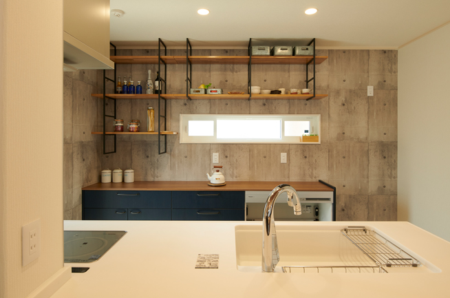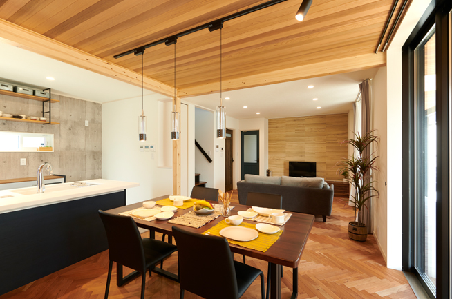 リビングダイニングの床は無垢材をヘリンボーン貼りにしてワンランク上の雰囲気に。チェッカーガラスの入った建具、造作のテレビボードに、木目調のエコカラットを採用するなど、こだわりの内装でコーディネート。キッチンは木とアイアンの収納棚を設けたカフェスタイルになっています。