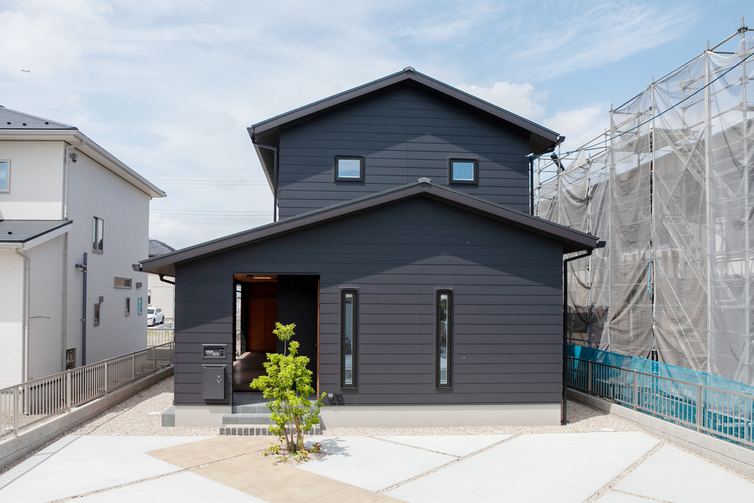 ダークグレーの金属サイディングにレッドシダーをふんだんに使った外壁。切妻屋根は、軒が出ることで日光や風雨から家屋を守ってくれる伝統のスタイル。美しさと快適さにこだわった住まいです。
