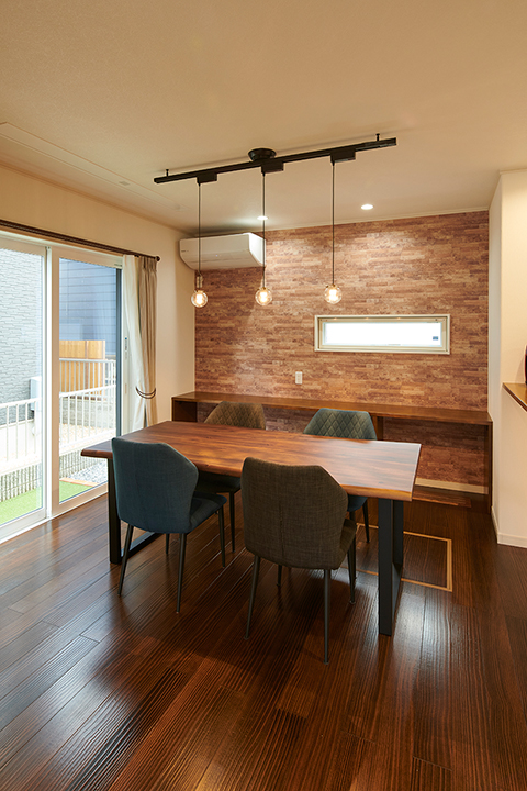 ダイニングサイドに設けた造作のデスクカウンター。書類を書いたりパソコン作業をしたり、家事や仕事で便利に使えます。カウンターの足元には床下エアコンを配備。冬は足元から家全体を暖めます。
