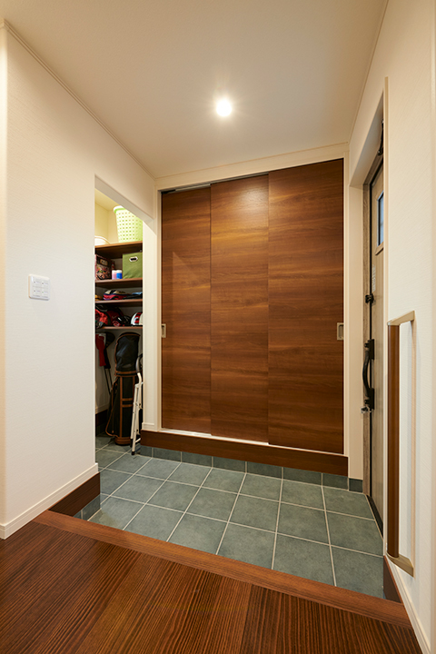 大容量の収納を確保した玄関スペース。左手は土間仕上げで可動棚を設けているから背の高いものや外で使うものをそのまま収納、正面は天井まであるフラットな扉ですっきりしまうことができます。