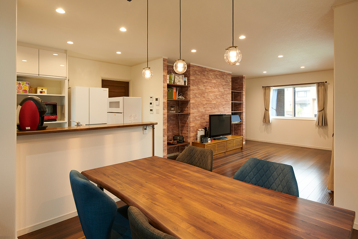 広々とした21.5帖のLDK。床や家具はダークトーンでシンプルにまとまっています。テレビボードの左右は可動棚、裏は廊下側に設けた収納があり、スペースをうまく使い分けました。ダイニングテーブルの上は、丸いフォルムがかわいらしい3本のペンダントライト。食卓を温かく照らします。