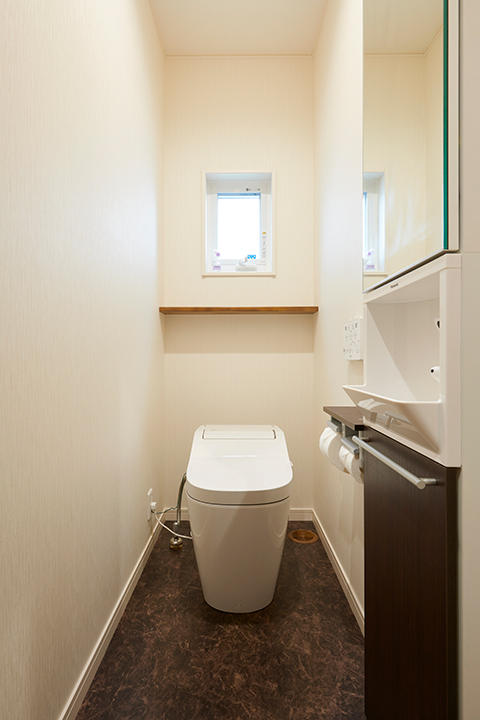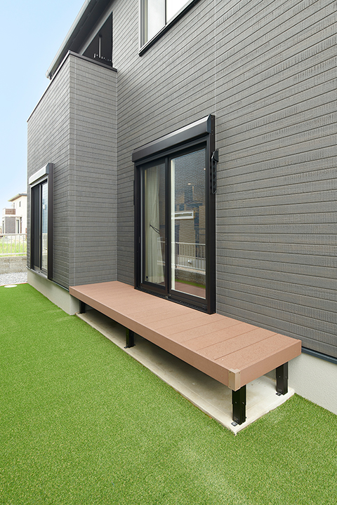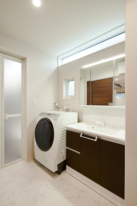 リビングの外側に広がるお庭。出入りしやすい縁側のようなデッキで家族みんなで楽しめそうです。リビングに合わせるようにブラウンを基調にシンプルにまとめられたサニタリー。広くて収納も確保された洗面所は、横長のハイサイドライトから明かりが入り、北向きでも爽やかに使えます。