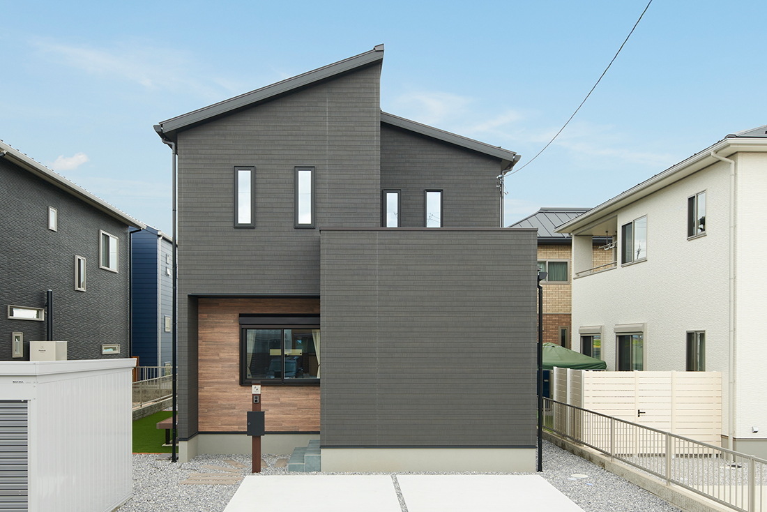 左右の片流れ屋根がシャープな印象を与える外観。凸凹をうまく配置し、木調のサイディングをアクセントにしました。外から玄関やバルコニーが直接見えないように配慮しています。