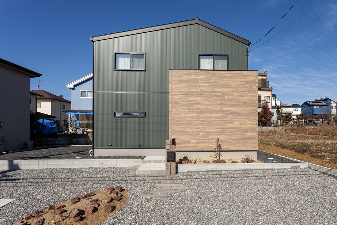 青空に映えるディープグリーンの住まい。メンズライクな印象のガルバリウムにナチュラルな木目調の外壁を組み合わせた家は、外観からもセンスの良さが伝わってきます。LDKも同様に、無骨なアイアンと木の温もりをミックスさせ、黒がアクセントの洗練された空間に仕上げられています。
